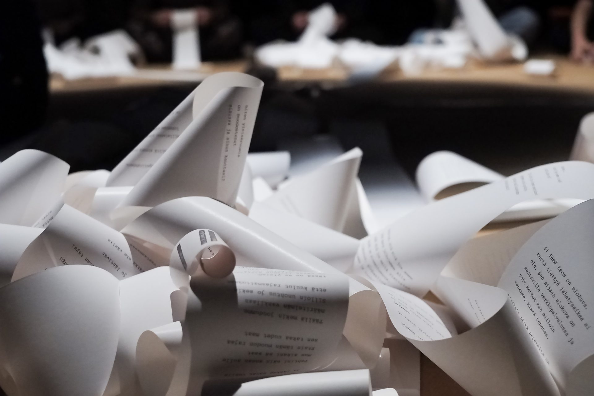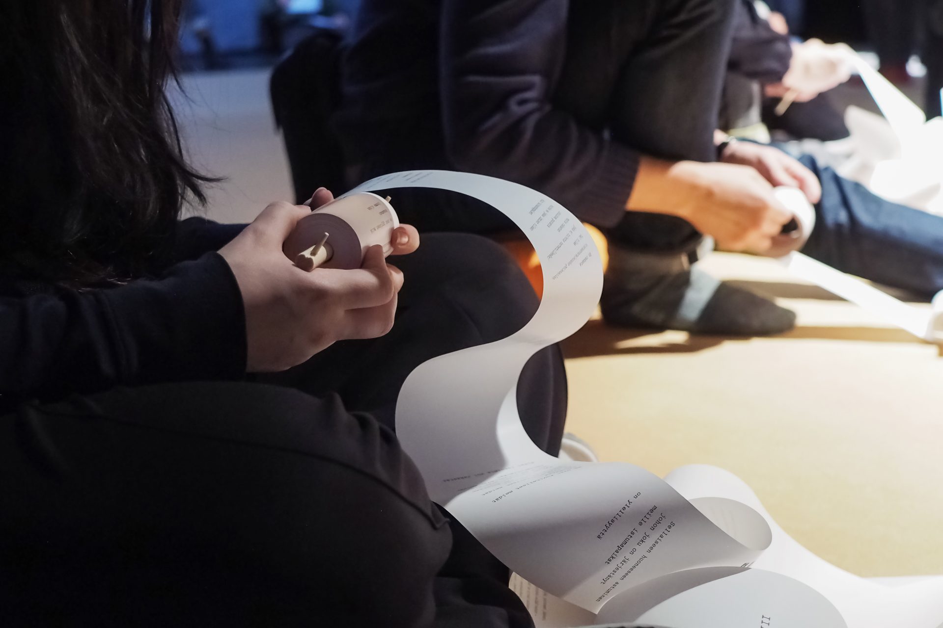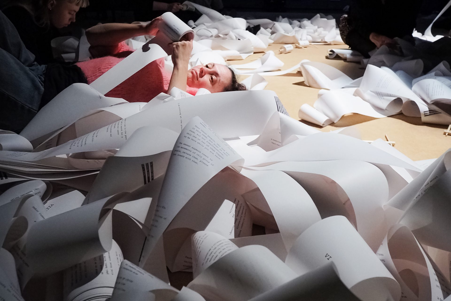 It is composed of several reading objects available to the audience: rolls of paper unwinding, love letters ripped, words eaten and hands immersed in water. Audience Body addresses the phenomenon of audience: its collectivity, liveness and the related tensions that appear when we gather in order to receive.